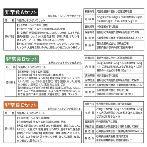 ①火や水を使わずに開けてそのまま食べられる災害時はガスや水道などが止まることも珍しくはありません。イシイの非常食は調理不要で、開けてそのまま召し上がりいただけるので、災害時にも安心。アルファ米と違い、水を使わないので省スペースで保管できます。②石井食品の製造過程において、食品添加物を使用しない「無添加調理」を原則としています。殺菌温度や商品パッケージを工夫し、素材のおいしさや安全性はそのままに、無添加調理で身体にやさしい保存食に仕上げています。③ビタミン・ミネラルが豊富な玄米を使用白米に比べて栄養バランスが良いとされる玄米を使用。災害時に不足しがちな栄養をカバーしやすい非常食・保存食になっています。食べやすく栄養がとれるため、災害時だけではなく日常の食事にも役立ちます。セット内容:A:玄米がゆ(220g)×2、玄米小豆がゆ(235g)×1、甘辛豚肉(50g)×1、きのこの佃煮(50g)×1。B:玄米がゆ(220g)×2、玄米梅がゆ(220g)×1、四目野菜のネギ油ピリ辛煮(50g)×1、ごぼうと鶏肉のしょうが煮(50g)×1。C:玄米がゆ(220g)×2、玄米梅がゆ(220g)×1、大豆と野菜のひじき煮(50g)×1、鶏肉とごぼうの旨煮(50g)×1。関連商品