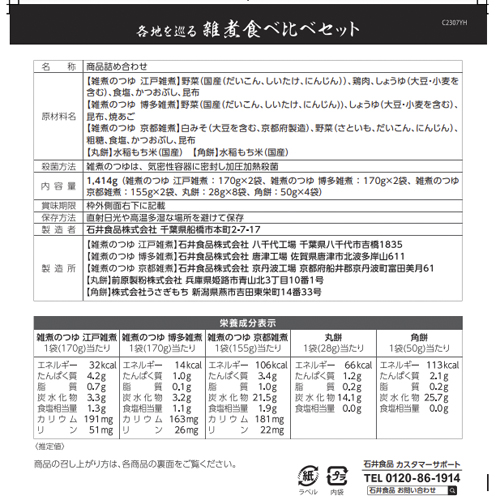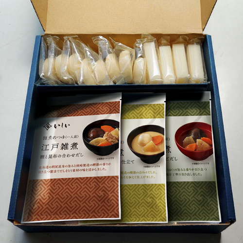 | 原材料 | 原材料名:【雑煮のつゆ江戸雑煮】野菜(国産(だいこん、しいたけ、にんじん))、鶏肉、しょうゆ(大豆・小麦を含む)、食塩、かつおぶし、昆布 【雑煮のつゆ博多雑煮】野菜(国産(だいこん、しいたけ、にんじん))、しょうゆ(大豆・小麦を含む)、昆布、焼あご 【雑煮のつゆ京都雑煮】白みそ(大豆を含む、京都府製造)、野菜(さといも、だいこん、にんじん)、粗糖、食塩、かつおぶし、昆布 【角餅】水稲もち米(国産) 【丸餅】水稲もち米(国産) |