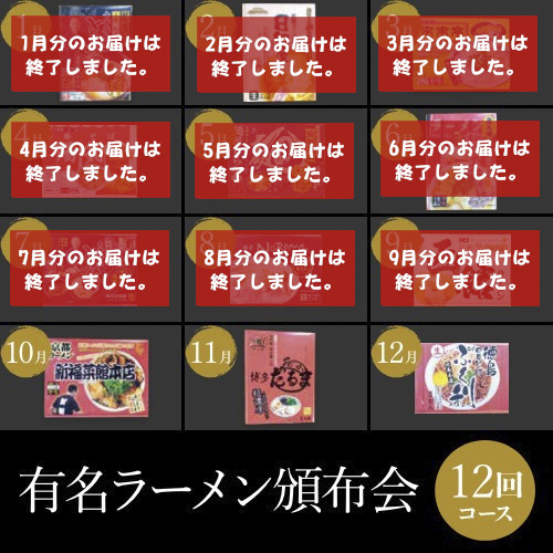 有名ラーメン頒布会12回コースを12月まで月替わりでお届け。12回コース10回目のお届け。コース内容:【全月】焼き豚Pモモ肉スライスチャーシュー250g 【10月】〔京都・京都ラーメン新福菜館〕ストレート中細麺100g×3、醤油スープ60g×3 【11月】〔福岡・博多だるま〕ストレート極細麺100g×3、背脂豚骨スープ68g×3 【12月】〔徳島・徳島中華そばふく利〕ストレート細麺100g×3、豚骨醤油スープ63g×3、ネギ0.15g×3。関連商品