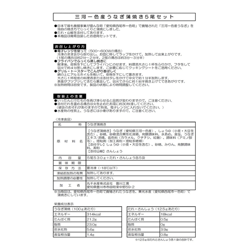 原材料 | 原材料名:【うなぎ蒲焼】うなぎ(愛知県三河一色産)、しょうゆ(小麦・大豆を含む)、砂糖、砂糖混合異性化液糖、発酵調味料、水あめ、食塩、うなぎエキス/酒精、着色料(カラメル、クチナシ、紅麹)、調味料(アミノ酸等)、増粘剤(加工澱粉・増粘多糖類)【添付タレ】しょうゆ(小麦・大豆を含む)、還元澱粉糖化物、ぶどう糖果糖液糖、みりん、食塩、澱粉/酒精、着色料(カラメル、紅麹)【添付山椒】さんしょう |