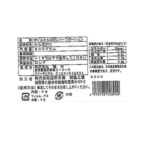 | 原産国加工地 | 原産国ロシア。主要な原材料たらばがに(ロシア)。 |