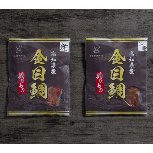 高知県産の金目鯛の切身を一晩漬け込んだ後、焼き上げました。やや甘めの味噌漬け焼きと、風味豊かな粕漬け焼きのセットです。