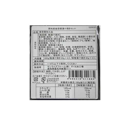 | 原材料 | 原材料名:【金目鯛 粕漬け焼き】金目鯛(高知)、たれ(酒粕、砂糖、食塩、醸造酢(小麦を含む)、卵殻粉末(卵を含む)、食物繊維(オレンジを含む)、蛋白加水分解物(大豆を含む))/調味料(アミノ酸等)、増粘多糖類、セルロース 【金目鯛 味噌漬け焼き】金目鯛(高知)、たれ(味噌、砂糖、米発酵調味料、甘酒、醤油(小麦を含む)、醸造酢、食塩、ねぎペースト、魚介エキス(さば・大豆を含む)、魚醤、生姜、昆布エキス、清酒、ウコン末、食物繊維(オレンジを含む)、酵母エキス、白キクラゲ抽出物)/増粘剤(加工でん紛、キサンタン) |