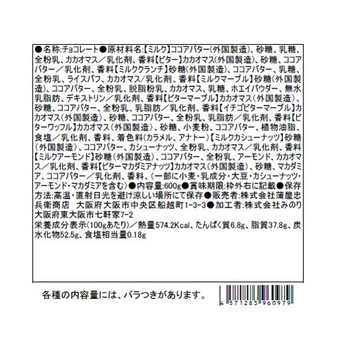 | 原材料 | 原材料名:【ミルク】ココアバター(外国製造)、砂糖、乳糖、全粉乳、カカオマス/乳化剤、香料【ビター】カカオマス(外国製造)、砂糖、ココアバター/乳化剤、香料【ミルククランチ】砂糖(外国製造)、ココアバター、乳糖、全粉乳、ライスパフ、カカオマス/乳化剤、香料【ミルクマーブル】砂糖(外国製造)、ココアバター、全粉乳、脱脂粉乳、カカオマス、乳糖、ホエイパウダー、無水乳脂肪、デキストリン/乳化剤、香料【ビターマーブル】ココアバター(外国製造)、砂糖、全粉乳、ココアパウダー、カカオマス、乳糖、ホエイパウダー、無水乳脂肪、デキストリン/乳化剤、香料【イチゴビターマーブル】ココアバター(外国製造)、砂糖、全粉乳、ココアパウダー、カカオマス、脱脂粉乳/乳化剤、着色料(ビートレッド)、香料、酸味料【ビターワッフル】ココアバター(外国製造)、砂糖、乳糖、小麦粉、ココアパウダー、カカオマス、植物油脂、食塩/乳化剤、香料、着色料(カラメル、アナトー)【ミルクカシューナッツ】砂糖(外国製造)、ココアバター、カシューナッツ、乳糖、全粉乳、カカオマス、/乳化剤、香料【ミルクアーモンド】砂糖(外国製造)、ココアバター、乳糖、全粉乳、アーモンド、カカオマス/乳化剤、香料【ビターマカダミアナッツ】ココアバター(外国製造)、マカダミアナッツ、砂糖、乳糖、ココアパウダー、カカオマス/乳化剤、香料(一部に小麦・乳成分・大豆・カシューナッツ・アーモンド・マカダミアナッツを含む) |