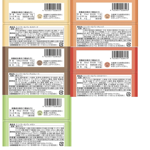 | 原材料 | 原材料名:【ミニくりーむパンカスタード】牛乳(国内製造)、小麦粉、乳等を主要原料とする食品、卵、砂糖、マーガリン、はちみつ、酵母、食塩、脱脂粉乳、ホエイパウダー、小麦グルテン、植物油脂/トレハロース、グリシン、乳化剤、pH調整剤、加工澱粉、酵素、安定剤(増粘多糖類)、リゾチーム、(一部に小麦・卵・乳成分・大豆を含む)【ミニくりーむパンチョコレート】牛乳(国内製造)、小麦粉、乳等を主要原料とする食品、卵、砂糖、準チョコレート、マーガリン、はちみつ、酵母、食塩、脱脂粉乳、ホエイパウダー、小麦グルテン、植物油脂/グリシン、トレハロース、乳化剤、pH調整剤、加工澱粉、酵素、香料、リゾチーム、安定剤(増粘多糖類)、(一部に小麦・卵・乳成分・大豆を含む)【ミニくりーむパンメロン】牛乳(国内製造)、小麦粉、乳等を主要原料とする食品、卵、砂糖、マーガリン、製菓ペースト(砂糖、果糖ブドウ糖液糖、水あめ、メロン、その他)、はちみつ、酵母、食塩、脱脂粉乳、ホエイパウダー、小麦グルテン、植物油脂/グリシン、トレハロース、乳化剤、香料、着色料(モナスカス、クチナシ)、pH調整剤、加工澱粉、酵素、酸味料、増粘多糖類、リゾチーム、安定剤(増粘多糖類)、(一部に小麦・卵・乳成分・大豆を含む)【ミニくりーむパンオレンジ】小麦粉(国内製造、韓国製造)、牛乳、乳等を主要原料とする食品、オレンジピューレ、卵、砂糖、オレンジ砂糖漬、マーガリン、はちみつ、酵母、寒天加工品(粉あめ、寒天)、食塩、脱脂粉乳、ホエイパウダー、小麦グルテン、植物油脂/トレハロース、グリシン、乳化剤、酒精、酵素、pH調整剤、加工澱粉、リゾチーム、安定剤(増粘多糖類)、香料、V.E、(一部に小麦・卵・乳成分・オレンジ・大豆を含む)【ミニくりーむパンストロベリー】いちごジャム(国内製造)、小麦粉、牛乳、乳等を主要原料とする食品、卵、砂糖、マーガリン、はちみつ、酵母、食塩、脱脂粉乳、ホエイパウダー、小麦グルテン、植物油脂/トレハロース、グリシン、ゲル化剤(ペクチン)、乳化剤、酸味料、酵素、pH調整剤、加工澱粉、リゾチーム、安定剤(増粘多糖類)、(一部に小麦・卵・乳成分・大豆を含む) |